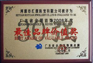 2009年2月25日,在廣東省金銀首飾商會(huì)舉行的年會(huì)上,河源市匯源珠寶有限公司被評(píng)為廣東省金銀首飾2008年度“最佳品牌價(jià)值獎(jiǎng)”稱號(hào)。
